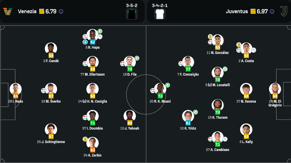 ริดเจเซียโน่ แฮปส์ แบ็กซ้ายของเวเนเซียแม้จะอยู่ทีมพ่ายแพ้ แต่ผลงานในสนามสะกดทุกสายตา เจ้าตัวเป็นคนจ่ายให้ฟิล่าทำประตูแรก ก่อนจะซัดเองในลูกตีเสมอ 2-2 ได้อย่างสุดเฉียบ แฮปส์สร้างโอกาสหลายครั้ง เติมเกมตลอด 90 นาที และเป็นจุดเด่นสำคัญของเกมรุกฝั่งซ้าย ได้คะแนนสูงสุดที่ 8.2 จากทั้งสองฝั่ง