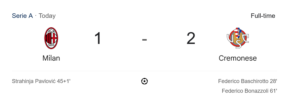 ค่ำคืนที่ซาน ซิโร่ กลายเป็นฝันร้ายของแฟนบอลปีศาจแดงดำ เมื่อ เอซี มิลาน เปิดบ้านพ่าย เครโมเนเซ่ 1-2 ในเกมนัดเปิดสนามกัลโช่ เซเรียอา แม้สถิติทุกอย่างจะเหนือกว่าชัดเจน แต่ความเฉียบคมและความเหนียวแน่นของทีมเยือนทำให้พวกเขาเป็นฝ่ายคว้าสามแต้มกลับออกไปได้ โดย บ้านผลบอล รายงานผลตรงจาก ผลบอลสด ที่เต็มไปด้วยความกดดันและการเล่นแบบเอาตายของทั้งสองทีม