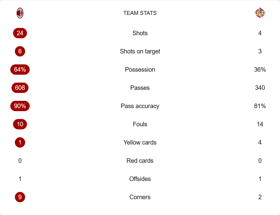ตัวเลขสะท้อนชัด มิลานครองบอล 64% ผ่านบอลกว่า 608 ครั้ง ความแม่นยำสูงถึง 90% ยิงทั้งหมด 24 ครั้ง เข้ากรอบ 6 แต่ได้แค่ประตูเดียว ส่วนเครโมเนเซ่ครองเพียง 36% จ่ายบอล 340 ครั้ง แม่นยำ 81% ยิง 4 ครั้ง เข้ากรอบ 3 และเปลี่ยนเป็น 2 ประตูเต็ม ๆ จุดเปลี่ยนสำคัญคือการป้องกันอย่างดุดันและนายประตูที่เหนียวแน่น ทำให้ทีมเยือนสร้างปาฏิหาริย์ได้
