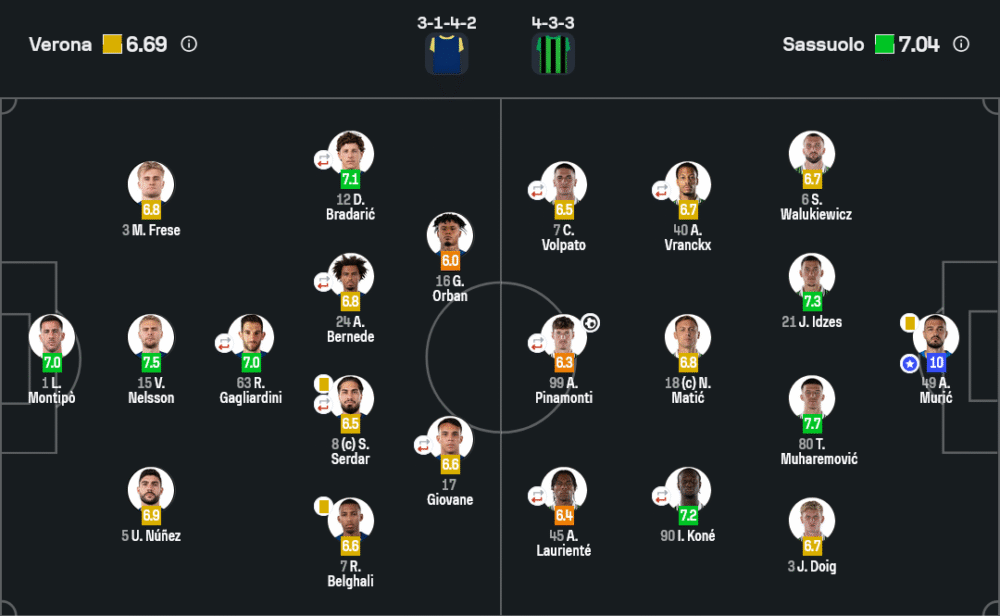 เกมเริ่มต้นขึ้นด้วยความดุดันจากฝั่งเจ้าถิ่น เวโรน่า ที่เปิดเกมรุกเข้าใส่ทันทีตามเสียงเชียร์ในสนาม ครองบอลได้มากกว่าด้วยอัตราครองบอลถึง 55% และมีโอกาสยิงถึง 9 ครั้ง แต่ทุกครั้งต้องเจอกับฟอร์มสุดหนึบของ อารียาเน็ต มูริช นายทวารของซัสเซาโล่ ที่ป้องกันได้ทุกจังหวะ จนคว้าคะแนนเต็มสิบจาก Sofascore ในเกมนี้