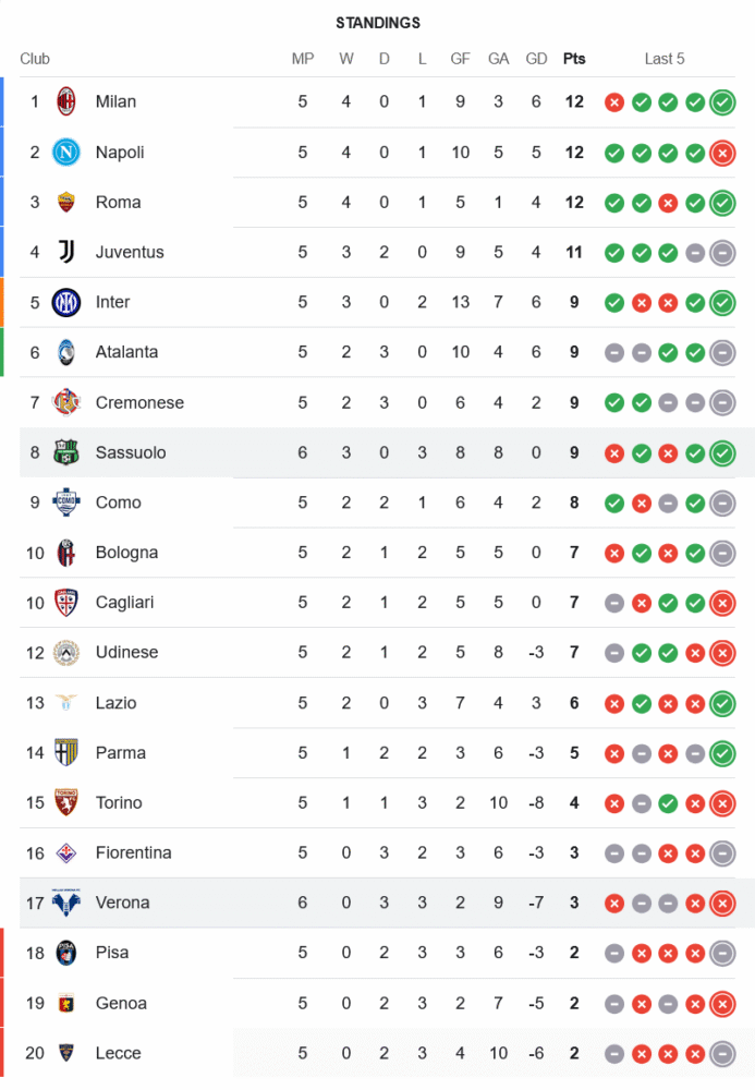 หลังเกมนี้ ซัสเซาโล่ เก็บเพิ่มเป็น 9 คะแนน ขยับขึ้นสู่อันดับ 8 ของตาราง มีลุ้นพื้นที่ยุโรป ขณะที่ เวโรน่า ยังคงสะกดคำว่าชนะไม่เป็น มีเพียง 3 คะแนนจาก 6 นัด รั้งอันดับ 17 สุ่มเสี่ยงตกชั้นหากฟอร์มไม่ดีขึ้นในเร็วๆ นี้