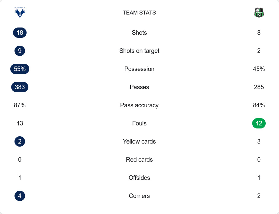 เกมนี้ทั้งสองทีมครองบอลพอๆ กัน เวโรน่าครองบอล 55% มีโอกาสยิงถึง 18 ครั้ง เข้ากรอบ 9 ครั้ง แต่ไม่สามารถเจาะตาข่ายได้ ขณะที่ ซัสเซาโล่ ครองบอล 45% ยิง 8 ครั้ง เข้ากรอบ 2 ครั้ง และเปลี่ยนเป็นประตูได้ 1 ครั้งจากจุดโทษ เวโรน่ามีการผ่านบอล 383 ครั้ง ความแม่นยำ 87% ส่วน ซัสเซาโล่ ผ่านบอล 285 ครั้ง ความแม่นยำ 84% เกมนี้ไม่มีใบแดง แต่มีใบเหลืองรวม 5 ใบ และฟาวล์รวม 25 ครั้ง