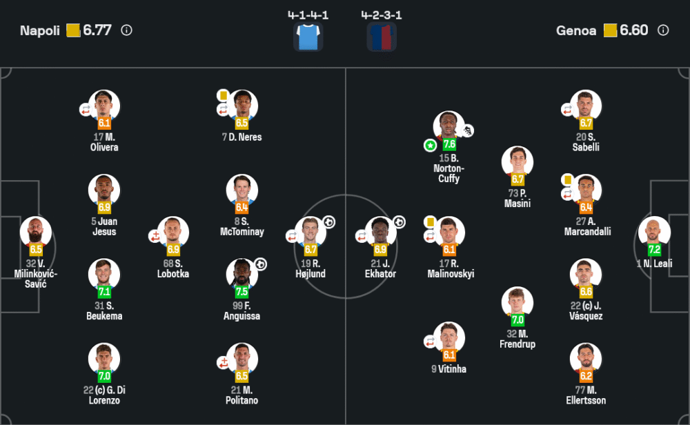 เบน นอร์ตัน-คัฟฟี่ (Genoa) – แม้ทีมจะแพ้ แต่ฟูลแบ็กรายนี้คือคนที่โดดเด่นที่สุดของทีมเยือน ด้วยพลังการวิ่งที่ไม่หมดและมีส่วนร่วมในจังหวะเกมรุก-รับตลอด 90 นาที ได้คะแนนสูงสุด 7.6