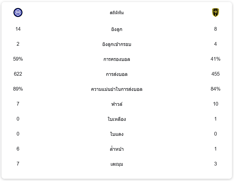 สถิติทีม ทีม อินเตอร์ มิลาน มีการยิงทั้งหมด 14 ครั้ง โดยยิงเข้ากรอบ 2 ครั้ง พวกเขาครองบอลได้ 59% และมีการส่งบอลถึง 622 ครั้งด้วยความแม่นยำ 89% การทำฟาวล์ทั้งหมด 7 ครั้ง ไม่มีใบเหลือง ไม่มีใบแดง ได้เตะมุม 7 ครั้ง และล้ำหน้า 6 ครั้ง