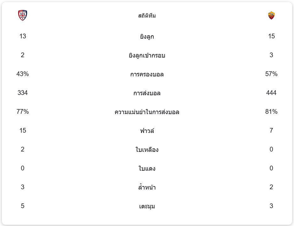 สถิติการแข่งขัน แสดงให้เห็นถึงการครองเกมของ เอเอส โรม่า ที่มีการส่งบอลทั้งหมด 444 ครั้งและมีความแม่นยำในการส่งบอลถึง 81% เทียบกับกาญารี่ที่มีการส่งบอล 334 ครั้งและความแม่นยำ 77% แม้ว่าทั้งสองทีมจะมีโอกาสทำประตูหลายครั้งแต่ก็ไม่สามารถแปรเปลี่ยนเป็นสกอร์ได้