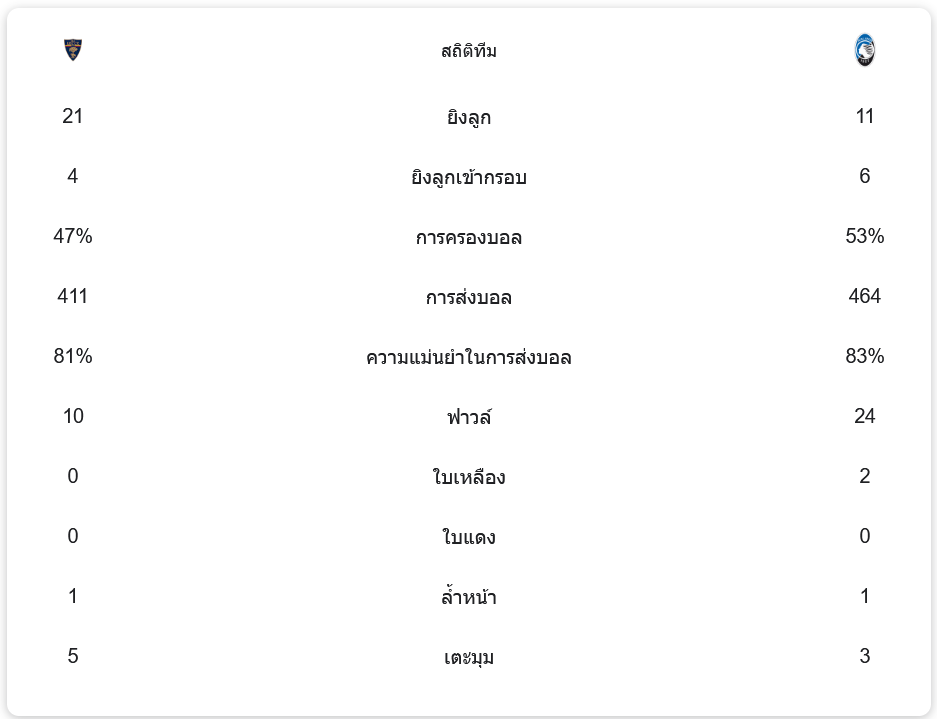 จากสถิติการแข่งขัน แสดงให้เห็นว่า เลชเช่ พยายามเต็มที่ในการสร้างโอกาส โดยมีการยิงทั้งหมด 21 ครั้ง แต่กลับยิงเข้ากรอบเพียง 4 ครั้งเท่านั้น ในขณะที่ อตาลันต้า แม้จะยิงน้อยกว่าเพียง 11 ครั้ง แต่ความแม่นยำสูงกว่าด้วยการยิงเข้ากรอบ 6 ครั้ง และเปลี่ยนเป็นประตูได้ถึง 4 ลูก อีกทั้งยังครองบอลได้เหนือกว่าด้วย 53% และส่งบอลสำเร็จถึง 83% นอกจากนี้ อตาลันต้า ยังใช้เกมเพรสซิ่งที่กดดันเจ้าบ้าน ทำให้ เลชเช่ ต้องเสียบอลบ่อยครั้งและไม่สามารถพัฒนาเกมรุกได้