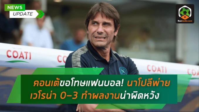 อันโตนิโอ คอนเต้ ผู้จัดการทีมคนใหม่ของ นาโปลี ออกมาเปิดใจยอมรับความจริงอย่างขมขื่น หลังจากที่พาทีมพ่ายแพ้อย่างยับเยินต่อ เฮลลาส เวโรน่า ด้วยสกอร์ 0-3 ในการแข่งขัน กัลโช่ เซเรีย อา อิตาลี เมื่อวันที่ 18 สิงหาคมที่ผ่านมา คอนเต้ไม่ได้ปิดบังความรู้สึก พร้อมขอโทษแฟนบอลทุกคนที่ต้องทนเห็นฟอร์มการเล่นที่น่าอับอายของทีมรัก
