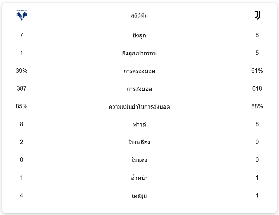 ยูเวนตุสครองบอลได้มากถึง 61% มีโอกาสยิงทั้งหมด 8 ครั้ง และเข้ากรอบ 5 ครั้ง ขณะที่เวโรน่ามีโอกาสยิงเพียง 7 ครั้ง โดยเข้ากรอบ 1 ครั้งเท่านั้น การส่งบอลของยูเวนตุสมีความแม่นยำถึง 88% จากการส่งบอล 618 ครั้ง ซึ่งมากกว่าฝ่ายตรงข้ามอย่างชัดเจน นอกจากนี้ทั้งสองทีมยังมีการทำฟาวล์เท่ากันที่ 8 ครั้ง
