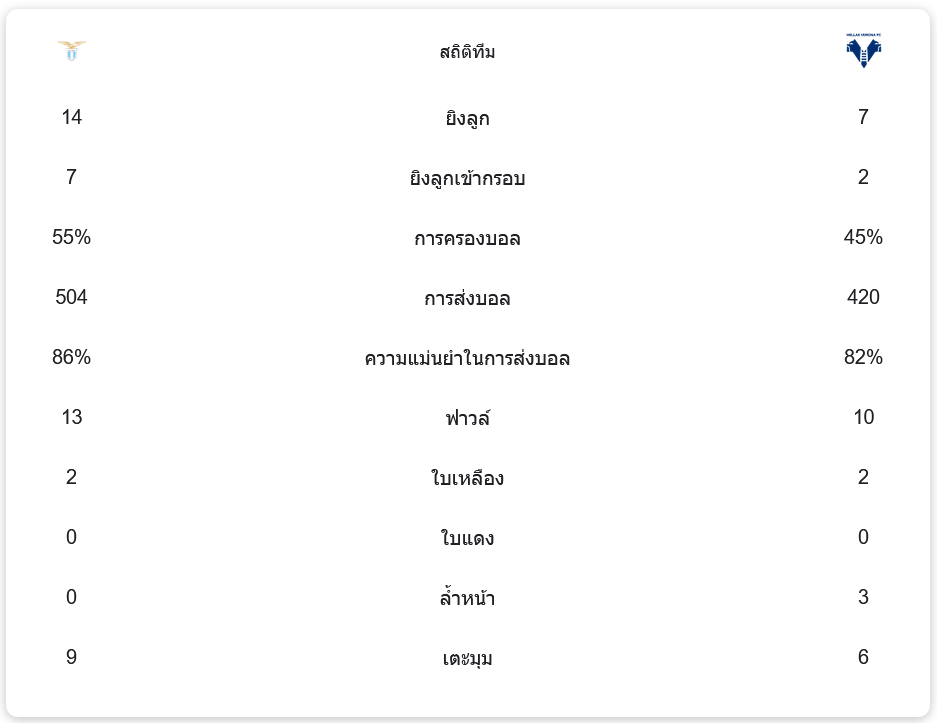 ลาซิโอ ครองบอลได้มากกว่า 55% และสร้างโอกาสยิงได้ถึง 14 ครั้ง โดยยิงเข้ากรอบ 7 ครั้ง ขณะที่ เวโรน่า สร้างโอกาสยิงได้ 7 ครั้ง เข้ากรอบเพียง 2 ครั้ง นอกจากนี้ ลาซิโอยังมีการส่งบอลที่แม่นยำถึง 86% จากการส่งบอลทั้งหมด 504 ครั้ง ขณะที่เวโรน่าส่งบอล 420 ครั้ง และมีความแม่นยำในการส่งบอล 82%