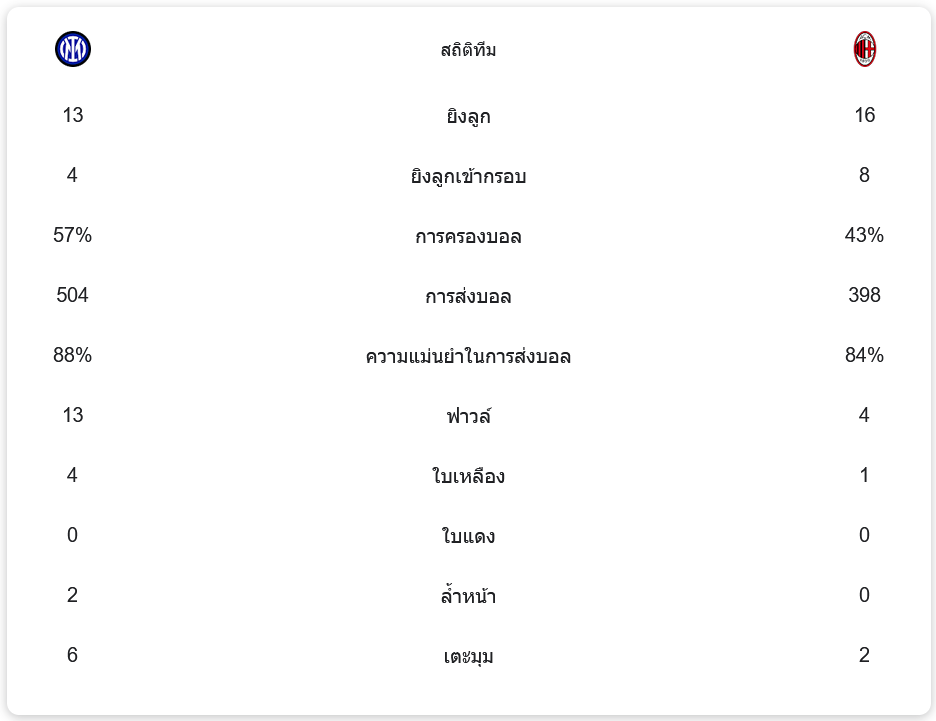 แม้อินเตอร์ มิลานจะมีสถิติครองบอลที่เหนือกว่าอยู่ที่ 57% และมีโอกาสยิงประตูถึง 13 ครั้ง แต่เอซี มิลานก็สามารถรักษาเกมรับและสร้างโอกาสได้ดี โดยมิลานยิงตรงกรอบถึง 8 ครั้งจากทั้งหมด 16 ครั้ง แม้ว่าการครองบอลจะน้อยกว่า แต่การโจมตีที่เฉียบคมของพวกเขาทำให้คว้าชัยชนะได้