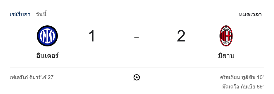 - นาทีที่ 89: มัตเตโอ กับเบีย (เอซี มิลาน) ยิงประตูชัย 1-2