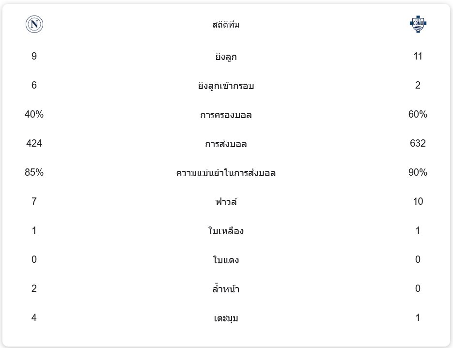 แม้ว่าโคโมจะครองบอลได้ถึง 60% ของเกมและมีการส่งบอลมากถึง 632 ครั้ง แต่พวกเขากลับไม่สามารถเจาะแนวรับของนาโปลีได้มากเท่าที่ควร โดยยิงเข้ากรอบได้เพียง 2 ครั้งเท่านั้น ส่วนนาโปลีมีความแม่นยำในการส่งบอลถึง 85% และครองบอลเพียง 40% แต่สามารถสร้างโอกาสทำประตูได้ถึง 9 ครั้งและยิงเข้ากรอบไป 6 ครั้ง เกมนี้โคโมทำฟาวล์มากถึง 10 ครั้ง และนาโปลีทำฟาวล์ 7 ครั้ง โดยทั้งสองทีมได้รับใบเหลืองทีมละ 1 ใบ