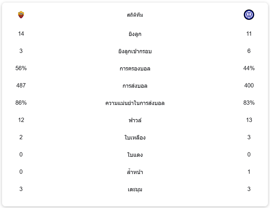 เกมนี้ โรม่า ครองบอลได้มากกว่าที่ 56% แต่ไม่สามารถเปลี่ยนเป็นประตูได้ แม้ว่าพวกเขาจะยิงได้ถึง 14 ครั้ง และเข้ากรอบ 3 ครั้ง ขณะที่ อินเตอร์ มิลาน มีการครองบอลเพียง 44% และมีโอกาสยิง 11 ครั้ง โดยเข้ากรอบ 6 ครั้ง นอกจากนี้ การส่งบอลของทั้งสองทีมยังค่อนข้างสูสีกัน โดยโรม่าใช้การส่งบอลไปทั้งหมด 487 ครั้ง และอินเตอร์ มิลาน 400 ครั้ง แสดงให้เห็นถึงความดุดันในการเล่นของทั้งสองทีม
