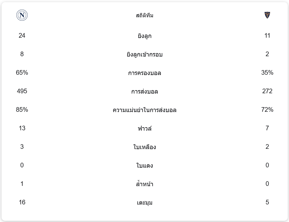 นาโปลีมีการครองบอลถึง 65% เมื่อเทียบกับเลชเช่ที่ทำได้เพียง 35% ทั้งนี้นาโปลียิงทั้งหมด 24 ครั้ง เข้ากรอบ 8 ครั้ง ขณะที่เลชเช่มีโอกาสยิงเพียง 11 ครั้ง เข้ากรอบแค่ 2 ครั้ง แสดงให้เห็นถึงการคุมเกมที่ยอดเยี่ยมของนาโปลี