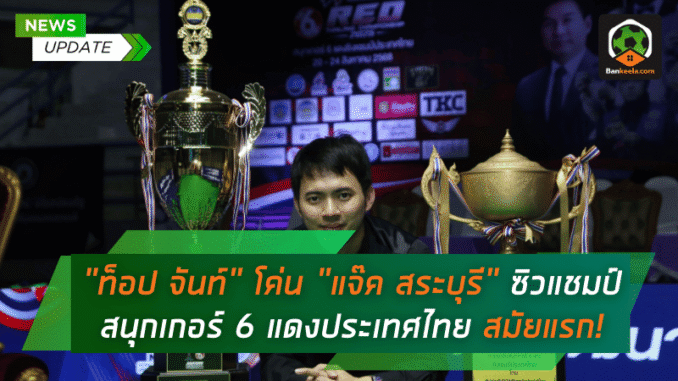 แมตช์นี้ทั้งสองต่างเปิดเกมด้วยความมั่นใจ แลกหมัดกันอย่างดุเดือดจนแต้มแทบไม่ห่างกัน แต่จุดเปลี่ยนสำคัญเกิดขึ้นในช่วงท้ายเกม เมื่อ ท็อป จันท์ ออกคิวได้อย่างเฉียบขาด คุมจังหวะและปิดเกมได้แม่นยำกว่ารุ่นพี่ ก่อนจะซิวชัยไปด้วยสกอร์ 8-6 เฟรม ผงาดคว้า แชมป์สนุกเกอร์ 6 แดงประเทศไทย สมัยแรก ไปครองได้สำเร็จ พร้อมเงินรางวัลก้อนโต 240,000 บาท ส่วน “แจ๊ค สระบุรี” แม้จะพลาดแชมป์ไปอย่างน่าเสียดาย แต่ก็ยังได้รางวัลรองแชมป์ 100,000 บาทเป็นกำลังใจ