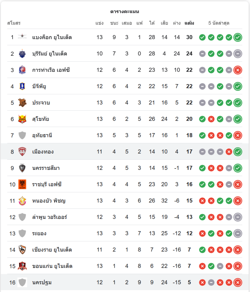 เมืองทอง ยูไนเต็ด ขยับขึ้นมาอยู่อันดับ 8 ของตาราง มี 17 คะแนนจาก 11 นัด ขณะที่ นครปฐม เอฟซี ยังคงอยู่อันดับสุดท้ายด้วยคะแนนเพียง 5 แต้ม