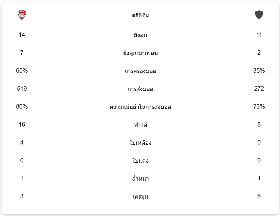 เมืองทอง ยูไนเต็ด ครองบอลได้ถึง 65% เมื่อเทียบกับ นครปฐม เอฟซี ที่ครองบอลเพียง 35% เมืองทองมีโอกาสยิงประตูทั้งหมด 14 ครั้ง และเข้ากรอบถึง 7 ครั้ง ส่วน นครปฐม ยิงได้ 11 ครั้ง และเข้ากรอบเพียง 2 ครั้ง ทำให้เห็นถึงความแม่นยำและการเล่นที่เด็ดขาดของ เมืองทอง ยูไนเต็ด