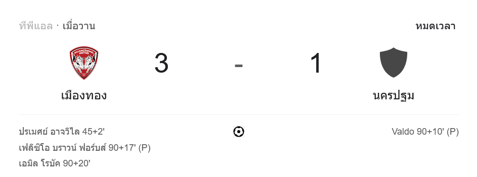 - ⚽️ นาทีที่ 90+17: ฟิลิป บราวน์ ฟอร์บส์ ยิงจุดโทษเพิ่มประตูให้ เมืองทอง (2-1)