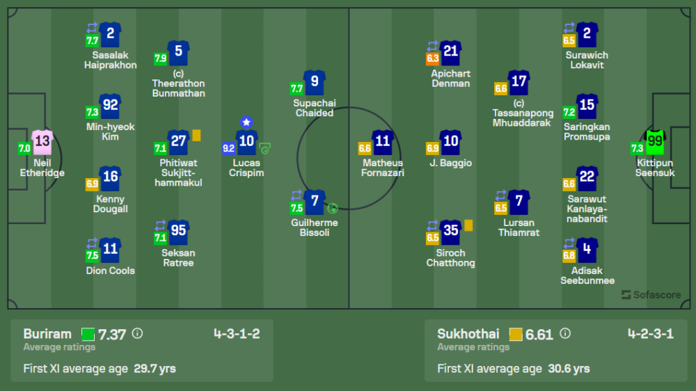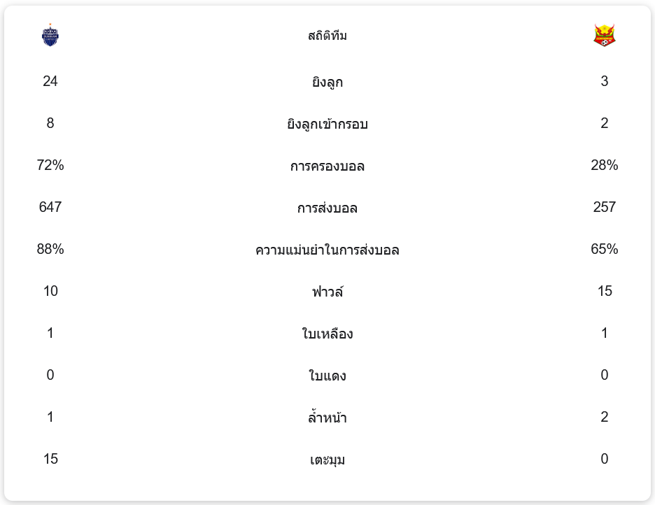 เกมนี้บุรีรัมย์มีสถิติที่โดดเด่นในทุกด้าน ยิงรวม 24 ครั้ง เข้ากรอบ 8 ครั้ง และครองบอล 72% ขณะที่สุโขทัย ยิงเพียง 3 ครั้ง เข้ากรอบ 2 ครั้ง การส่งบอลของบุรีรัมย์อยู่ที่ 647 ครั้ง พร้อมความแม่นยำสูงถึง 88%