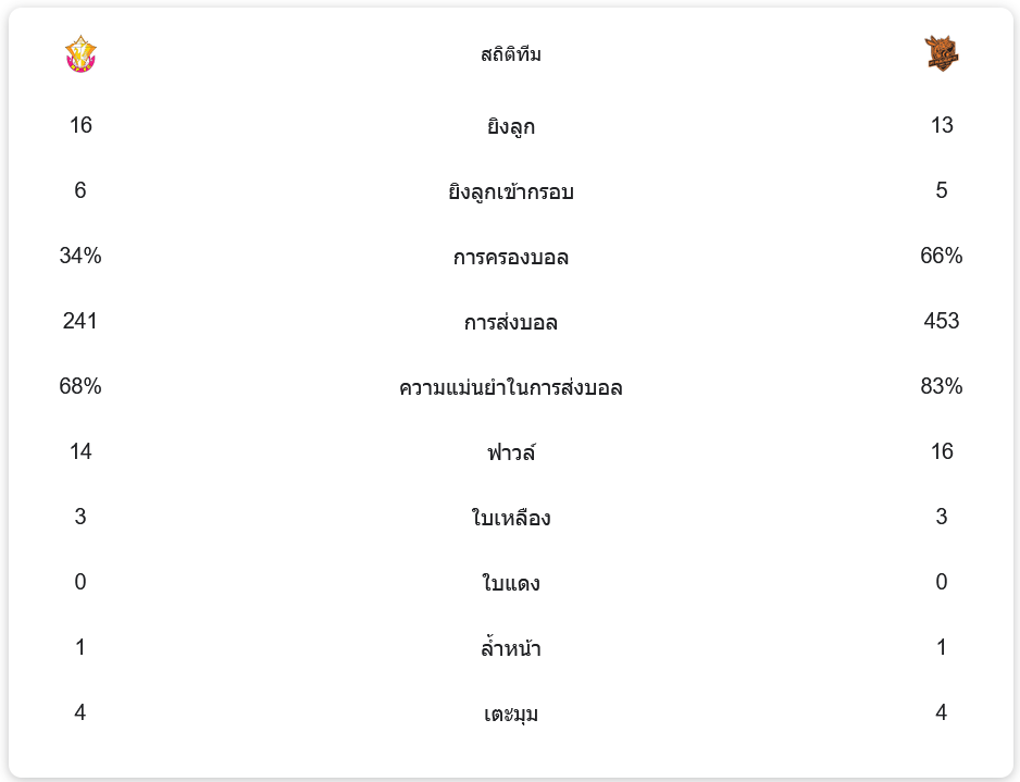จากข้อมูล บ้านผลบอล ระบุว่า หนองบัวพิชญมีการครองบอลเพียง 34% เท่านั้น แต่สามารถยิงเข้ากรอบได้ 6 ครั้ง จากโอกาสทั้งหมด 16 ครั้ง ขณะที่ประจวบคีรีขันธ์ครองบอลได้มากถึง 66% แต่ยิงเข้ากรอบได้เพียง 5 ครั้ง