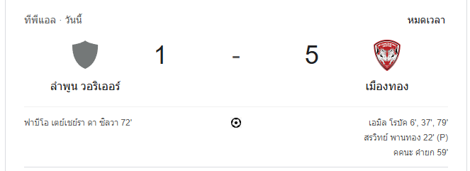 บ้านกีฬา รายงานผลบอลสดศึกไทยลีก 2024 แมตช์ที่เต็มไปด้วยความดุดันและเร้าใจระหว่างลำพูน วอร์ริเออร์ เปิดบ้านพบกับ เมืองทอง ยูไนเต็ด เกมนี้ทีมเยือนโชว์ฟอร์มร้อนแรง เอมิล โรแบ็ค ระเบิดแฮตทริก สรวิศ พานทอง และกัณตพ คำยศ บวกเพิ่ม ส่งเมืองทองถล่มเจ้าบ้าน 5-1 แม้ว่าลำพูนจะพยายามตีไข่แตกจากฟาบินโญ่ แต่ไม่เพียงพอที่จะเปลี่ยนเกม ผลการแข่งขันนี้ถือเป็นการยืนยันฟอร์มสุดเข้มของเมืองทองในฤดูกาลนี้