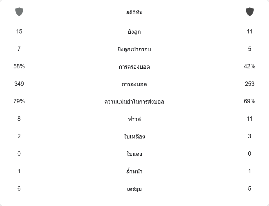 ระยอง เอฟซี เป็นฝ่ายครองบอล 58% ขณะที่ ลำพูน วอร์ริเออร์ มี 42% การส่งบอลของระยองอยู่ที่ 349 ครั้ง เทียบกับลำพูนที่ทำได้ 253 ครั้ง ระยองมีโอกาสยิงมากกว่าที่ 15 ครั้ง ตรงกรอบ 7 ครั้ง ส่วนลำพูนยิง 11 ครั้ง ตรงกรอบ 5 ครั้ง ใบเหลืองเกิดขึ้นรวม 5 ใบ โดยระยองได้ไป 2 ใบ ลำพูนได้ไป 3 ใบ