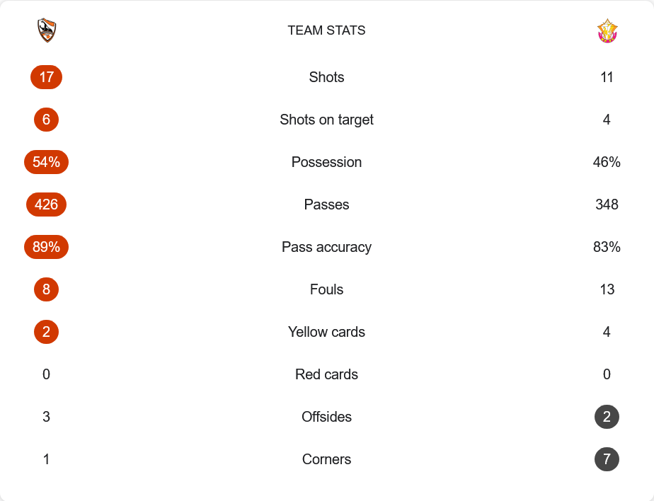 ทั้งสองทีมทำผลงานได้อย่างดุเดือด โดย เชียงราย ยูไนเต็ด มีโอกาสยิงมากถึง 17 ครั้ง และเข้ากรอบ 6 ครั้ง ขณะที่ หนองบัวพิชญ เอฟซี มีโอกาสยิง 11 ครั้ง และเข้ากรอบ 4 ครั้ง แม้จะมีการครองบอลน้อยกว่าที่ 46% แต่ก็ยังสามารถสร้างโอกาสอันตรายได้หลายครั้ง