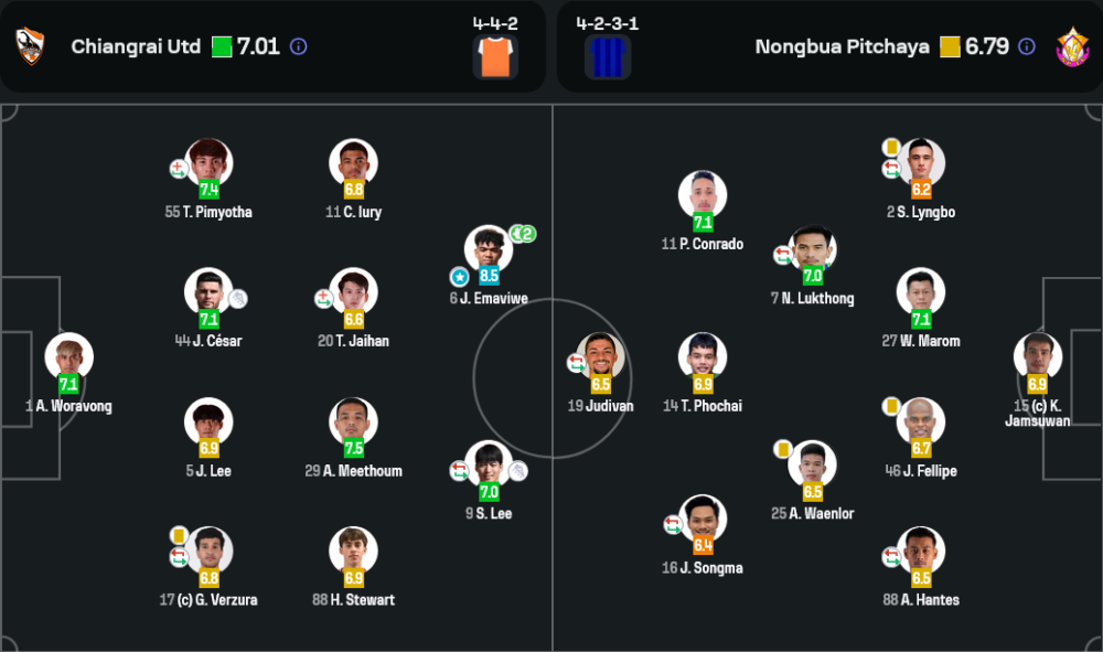 🏆 จอร์แดน เอมาไวเว (เชียงราย ยูไนเต็ด) ได้คะแนนสูงสุด 8.5 จากการยิง 2 ประตู ในเกมนี้ และมีบทบาทสำคัญในการช่วยทีมคว้าชัย