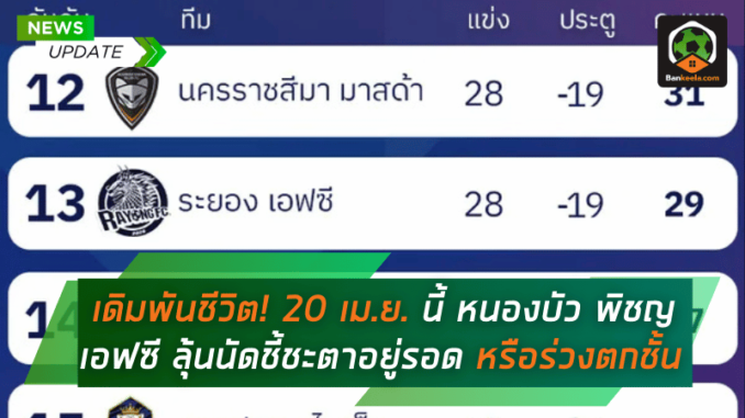 - ทางรอดเพียงหนึ่งเดียวของหนองบัว พิชญ คือ “ต้องชนะทั้ง 2 นัดที่เหลือ” เพื่อมีแต้มรวม 33 คะแนน พร้อมกับลุ้นให้ นครราชสีมา เก็บเพิ่มได้ไม่เกิน 1 แต้ม และ ระยอง เก็บได้ไม่เกิน 2 แต้ม มิฉะนั้น หากแต้มเท่ากันเมื่อจบฤดูกาล หนองบัวฯ จะตกชั้นทันที เพราะผลการเจอกันเป็นรองทั้งสองทีม