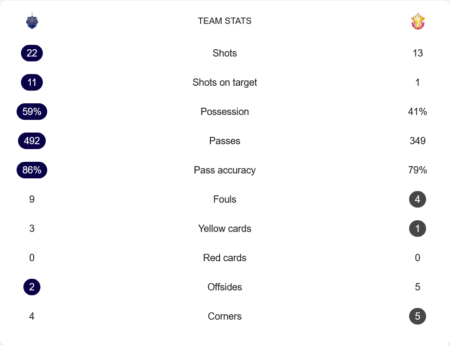 ตลอดทั้งเกม บุรีรัมย์ ยูไนเต็ดเป็นฝ่ายคุมเกมได้เหนือกว่า โดยครองบอลไปถึง 59% เทียบกับหนองบัวที่มีเพียง 41% โดยบุรีรัมย์ยิงทั้งหมด 22 ครั้ง เข้ากรอบ 11 ครั้ง ขณะที่หนองบัวยิง 13 ครั้ง แต่เข้ากรอบเพียงครั้งเดียว การผ่านบอลของเจ้าถิ่นอยู่ที่ 492 ครั้งและมีความแม่นยำถึง 86% ขณะที่ฝั่งเยือนผ่านบอล 349 ครั้ง แม่นยำ 79% ถือเป็นการคุมเกมแบบเบ็ดเสร็จเด็ดขาดของทีมเจ้าบ้าน
