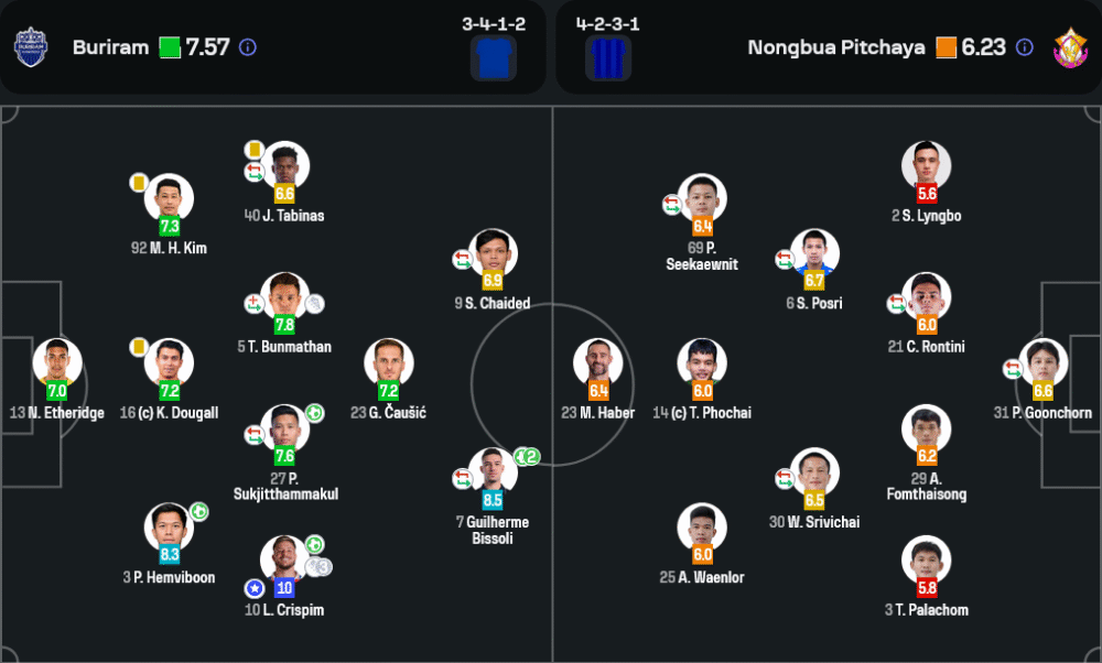 จากแผน 3-4-1-2 ของบุรีรัมย์ ถือว่ามีการบาลานซ์ระหว่างเกมรับและเกมรุกอย่างลงตัว โดยมี ลูคัส คริสพิม ทำหน้าที่จอมทัพคอยเชื่อมเกม และใช้ความเร็วของศุภชัยกับบิสโซลี่ในการเจาะแนวรับ ซึ่งแผนนี้ช่วยให้ครองเกมบุกได้ตลอด 90 นาที ฝั่งหนองบัวจัดแผน 4-2-3-1 เพื่อเน้นรับแล้วโต้กลับ แต่กลับถูกเจาะง่ายเกินคาด การยืนโซนไม่เป็นระเบียบและความช้าในแดนกลางทำให้พังยับเยินแบบหมดทางต้าน เกมนี้วิเคราะห์บอลได้ว่าเป็นภาพสะท้อนความแตกต่างของระดับทีมอย่างชัดเจน