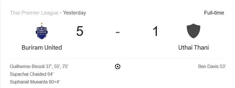 ศึก ไทยลีก ค่ำคืนเดือดที่ช้างอารีนา “บ้านกีฬา” พาเกาะติดแบบ ผลบอลสด ตั้งแต่นาทีแรก และจบด้วยรอยยิ้มของแฟนเจ้าบ้านเมื่อ บุรีรัมย์ ยูไนเต็ด ไล่ยำ อุทัยธานี เอฟซี 5-1 เกมนี้เห็นภาพชัดว่าศักยภาพและความเฉียบคมหน้าปากประตูคือของจริง กิลแญ่ร์เม่ บิสโซลี ใส่ชื่อไว้สามตุง ขณะที ซุปปาฉาย ชัยเดช กับ สุภนันท์ มีเอนตา ช่วยปิดสกอร์อีกคนละหนึ่ง ลูกทีมของออสมาร์ ลอสส์ เดินหน้ากวาดแต้มเต็มสองนัดติดบนทางด่วนลุ้นป้องกันแชมป์