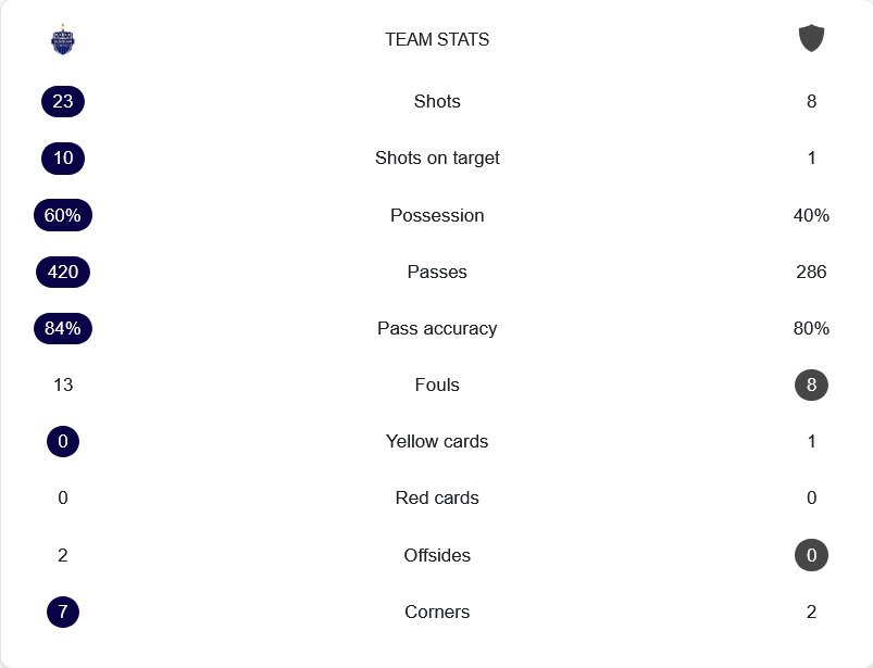 ภาพรวมตัวเลขบอกเรื่องทั้งหมด—บุรีรัมย์กดดันต่อเนื่องด้วยโอกาสยิงถึง 23 ครั้ง เข้ากรอบ 10 ครั้ง ครองบอล 60% ต่อจ่าย 420 ครั้งด้วยความแม่น 84% เกมรุกไหลลื่นตั้งแต่แดนสองถึงกรอบหกหลา ตรงข้ามกับอุทัยธานีที่มีโอกาสเพียง 8 ครั้ง เข้ากรอบหนเดียว ครองบอล 40% ต่อจ่าย 286 ครั้งและความแม่น 80% ต้องถอยตั้งรับนาน ทำให้ขึ้นเกมยาก ใบเหลืองทีมเยือน 1 ครั้ง ขณะที่เจ้าบ้านเล่นมีวินัยไม่มีใบ