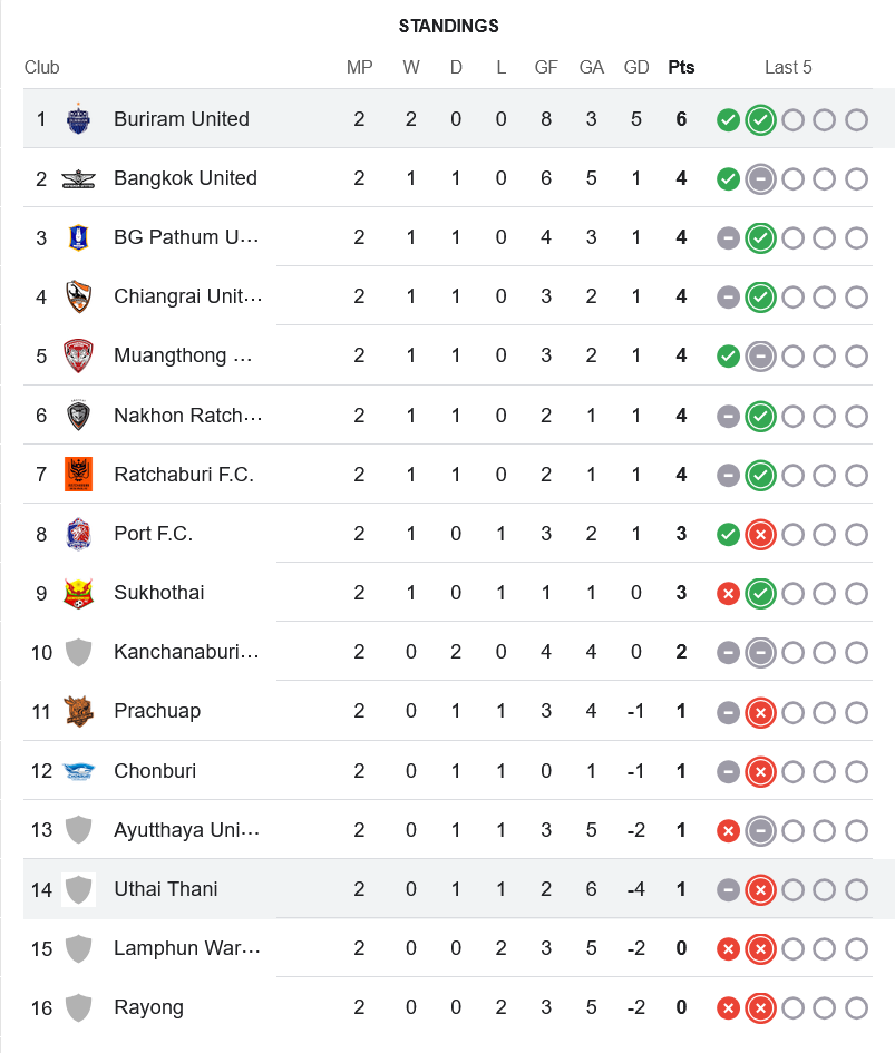 ผ่านสองนัด บุรีรัมย์ ยูไนเต็ด เก็บ 6 แต้มเต็ม ประตูได้เสีย +5 ทะยานยืนจ่าฝูงชัดเจนกับฟอร์มร้อนแรง ส่วน อุทัยธานี เอฟซี มี 1 แต้ม อยู่อันดับ 14 ประตูได้เสีย -4 ต้องเร่งแก้เกมรับและสมาธิในพื้นที่สุดท้าย หากไม่อยากไปลุ้นหนีโซนท้ายตารางยาว ๆ