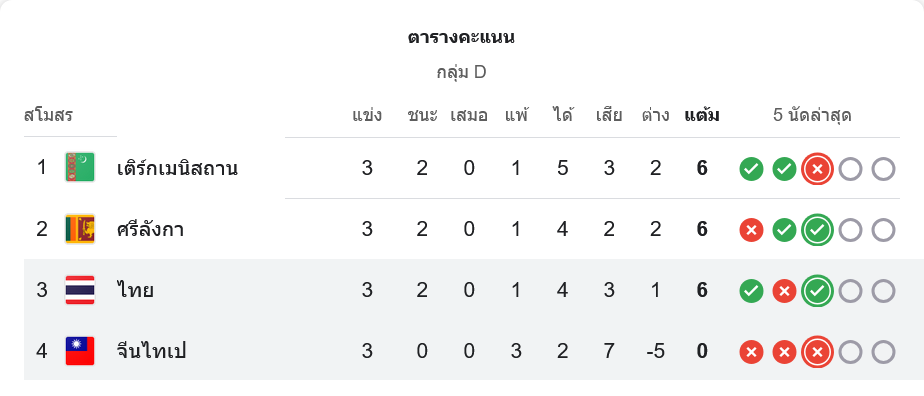 หลังจบนัดนี้ ทีมชาติไทย เก็บเพิ่มเป็น 6 คะแนนจาก 3 นัด เท่ากับ เติร์กเมนิสถาน และศรีลังกา แต่ยังรั้งอันดับ 3 ด้วยผลต่างประตูได้เสียที่เป็นรอง (+1) ซึ่งสถานการณ์ในกลุ่ม D เปิดกว้างสุด ๆ สามทีมมีสิทธิ์ลุ้นเข้ารอบต่อไปเต็มตัว ส่วนจีน-ไต้หวันแพ้รวด 3 นัด จมบ๊วยของกลุ่ม