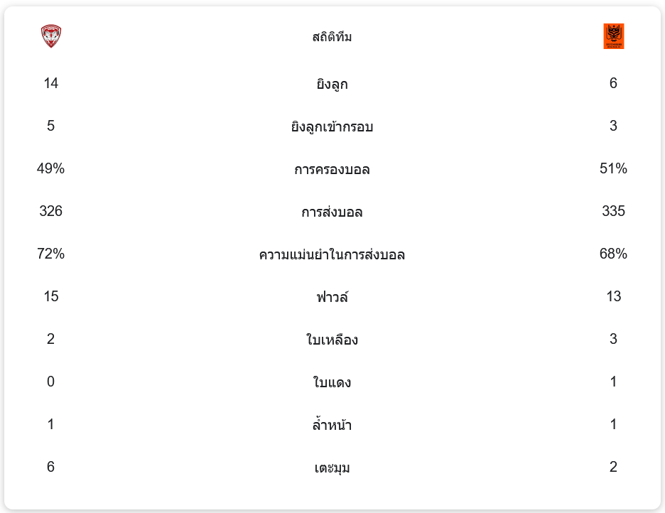 แม้ว่าเกมนี้จะสูสีในการครองบอล โดยเมืองทองครองบอล 49% และราชบุรีครองบอล 51% แต่เมืองทองสามารถสร้างโอกาสในการทำประตูได้มากกว่า โดยมีการยิงทั้งหมด 14 ครั้ง ยิงเข้ากรอบ 5 ครั้ง ในขณะที่ราชบุรีมีการยิงทั้งหมด 6 ครั้ง ยิงเข้ากรอบ 3 ครั้ง ความแม่นยำในการส่งบอลของเมืองทองอยู่ที่ 72% จากการส่งบอล 326 ครั้ง ส่วนราชบุรีมีความแม่นยำ 68% จากการส่งบอล 335 ครั้ง ทั้งสองทีมทำฟาวล์รวมกันถึง 28 ครั้ง โดยเมืองทองทำฟาวล์ 15 ครั้ง และราชบุรี 13 ครั้ง เมืองทองได้รับใบเหลือง 2 ใบ ขณะที่ราชบุรีได้รับใบเหลือง 3 ใบและใบแดง 1 ใบ