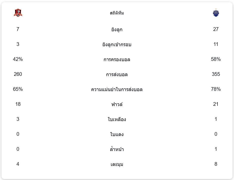 บุรีรัมย์ ยูไนเต็ด ครองบอลมากกว่าขอนแก่น ยูไนเต็ด โดยมีอัตราการครองบอล 58% เทียบกับขอนแก่นที่มี 42% บุรีรัมย์มีโอกาสยิงทั้งหมด 27 ครั้ง ยิงเข้ากรอบ 11 ครั้ง ขณะที่ขอนแก่นมีโอกาสยิง 7 ครั้ง ยิงเข้ากรอบ 3 ครั้ง ความแม่นยำในการส่งบอลของบุรีรัมย์สูงถึง 78% จากการส่งบอล 355 ครั้ง ส่วนขอนแก่นมีความแม่นยำในการส่งบอลที่ 65% จากการส่งบอล 260 ครั้ง การทำฟาวล์เกิดขึ้นบ่อยครั้งในเกมนี้ โดยขอนแก่นทำฟาวล์ 18 ครั้ง ได้รับใบเหลือง 3 ใบ ขณะที่บุรีรัมย์ทำฟาวล์ 21 ครั้ง และได้รับใบเหลือง 1 ใบ