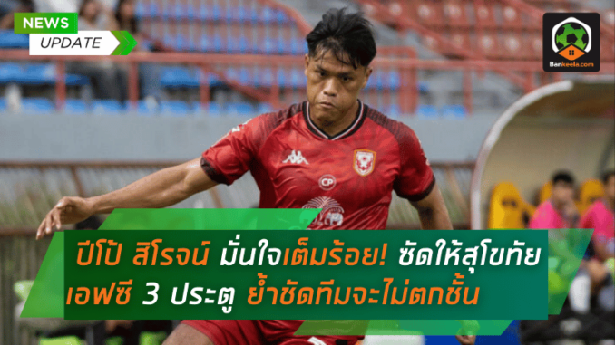 “ปีโป้” สิโรจน์ ฉัตรทอง นักเตะฟอร์มร้อนแรงของ สุโขทัย เอฟซี สร้างความประทับใจให้แฟนบอลหลังระเบิดฟอร์มซัดประตูให้ทีมได้ถึง 3 ลูกในฤดูกาลนี้ แม้สถานการณ์ทีมจะยังน่าเป็นห่วง แต่เจ้าตัวยังคงเชื่อมั่นว่า สุโขทัย เอฟซี จะสามารถหนีตกชั้นได้อย่างแน่นอน