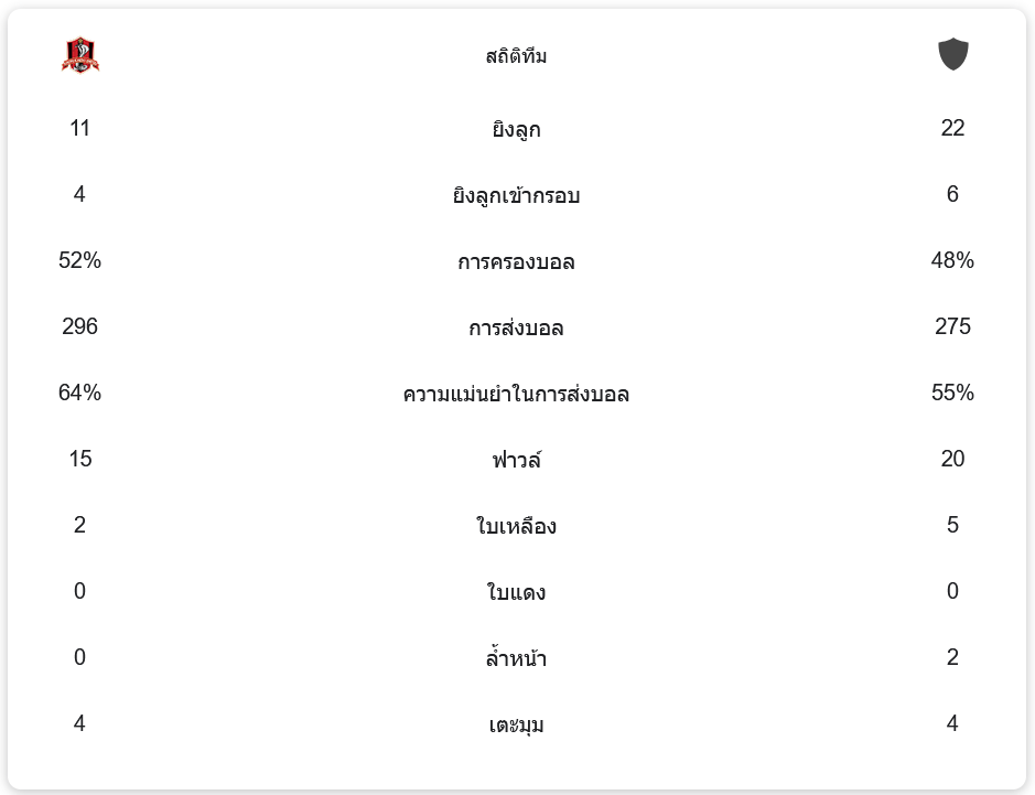 - นาทีที่ 90+1 ใบเหลืองให้ K. Yaidee จากนครปฐม