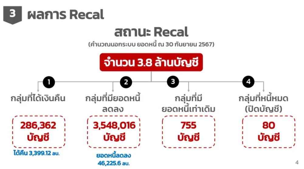 จากการ recal หรือการคำนวณหนี้ใหม่เมื่อ 30 ก.ย. 2567 พบว่าจากผู้กู้ทั้งหมด 3.8 ล้านบัญชี มีผลลัพธ์ดังนี้