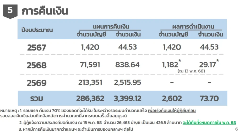 - ✅ กลุ่มที่ได้เงินคืน: 286,362 บัญชี เป็นเงิน 3,399 ล้านบาท