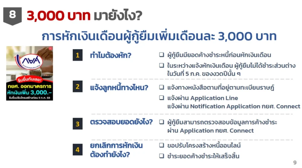 กรณีการหักเงินเดือนเพิ่ม 3,000 บาทต่อเดือน สร้างความสับสนและเครียดให้ผู้กู้จำนวนมาก โดยสาเหตุหลักมาจากผู้กู้มียอดค้าง หรือไม่ปรับโครงสร้างหนี้ให้ทันกำหนด กยศ. จึงเริ่มหักเงินเพิ่มเพื่อลดยอดค้าง โดยแจ้งลูกหนี้ผ่านเอกสาร, LINE, และแอป กยศ. Connect พร้อมเปิดช่องให้ยื่นขอลดการหักเงิน หรือปรับโครงสร้างได้ง่าย ๆ ออนไลน์