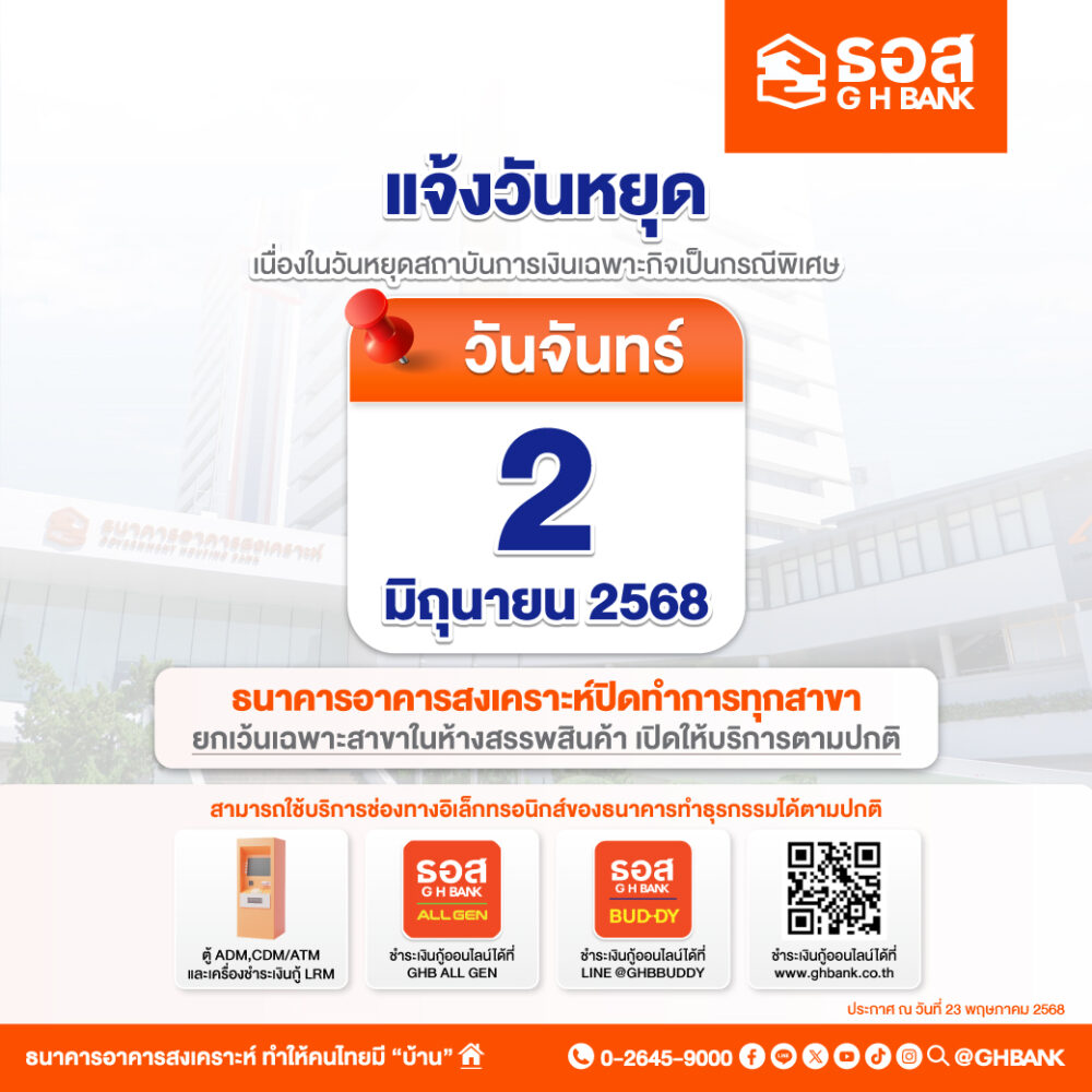 • วันจันทร์ที่ 2 มิถุนายน 2568 (วันหยุดพิเศษ)