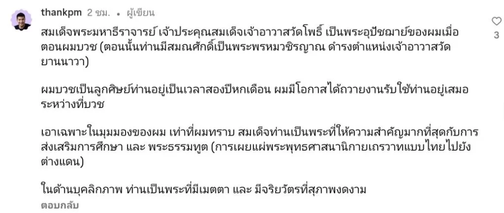 แต๊งค์โพสต์อย่างตรงไปตรงมาว่า การปราบปรามพระที่ทำผิดเป็นสิ่งจำเป็น แต่การให้ข่าวโดยไม่ชัดเจนกลับเป็นการสร้างบาปให้คนพูดลอยๆ กับพระที่อาจไม่ได้เกี่ยวข้องด้วย เขาย้ำว่าตนเองเคยบวชเป็นลูกศิษย์ของสมเด็จพระมหาธีราจารย์นานกว่า 2 ปีครึ่ง และตลอดเวลาที่ถวายงานอยู่ใกล้ชิด ได้เห็นแต่ความเมตตา ความมุ่งมั่นในการเผยแผ่พระธรรม และบุคลิกภาพที่น่าเคารพของท่าน