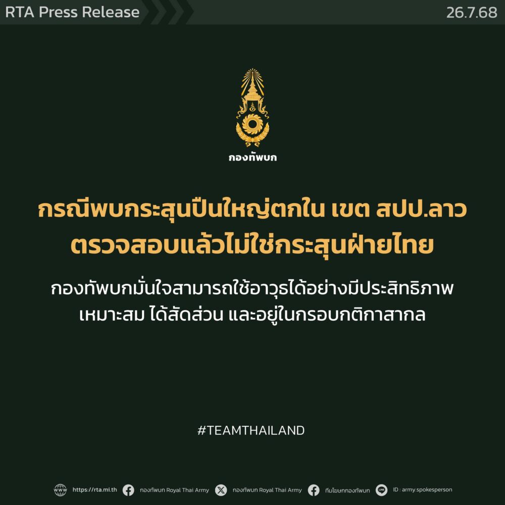 ในขณะที่บางกระแสพยายามโยนความผิดให้ไทยว่าเป็นผู้ยิงกระสุนเหล่านั้นข้ามแดน กองทัพไทยกลับยืนยันชัดว่า “ไม่ใช่ของเรา” พร้อมเปิดหลักฐานการตรวจสอบร่วมกับ สปป.ลาว และเผยข้อมูลเชิงลึกที่อาจชี้ไปถึง “เจตนาซ่อนเร้น” ของฝ่ายกัมพูชา