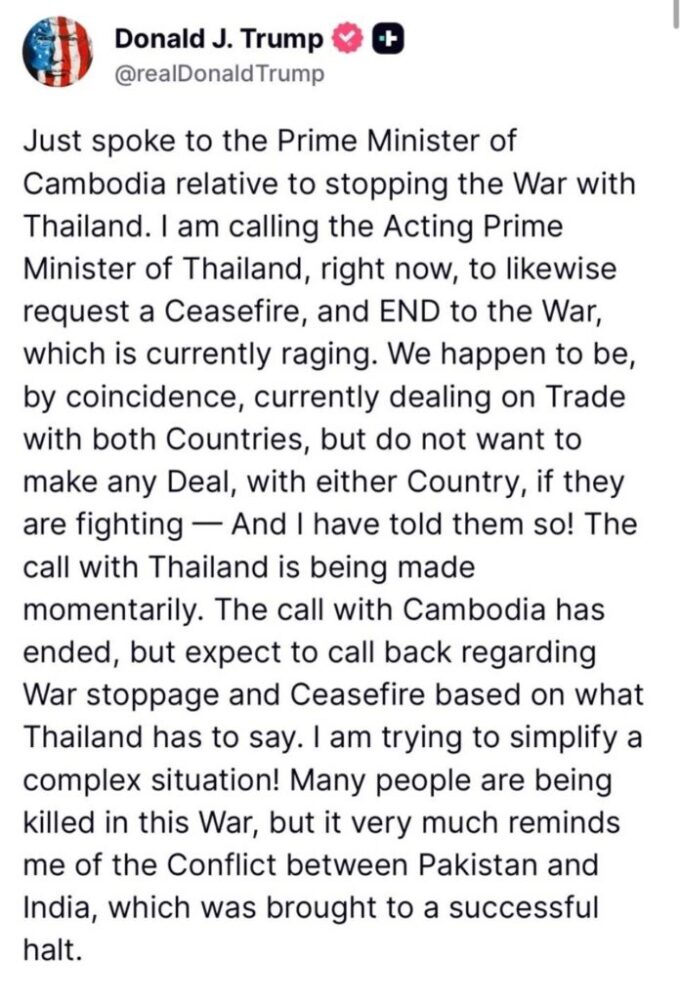 ฝั่งวาทกรรมการเมืองก็ร้อนแรงไม่แพ้แนวรบ! ทรัมป์ โพสต์ข้อความผ่านบัญชี @realDonaldTrump ระบุว่า เขาได้ “พูดคุยโดยตรงกับผู้นำทั้งไทยและกัมพูชา” และบอกชัดว่า “หากยังไม่หยุดยิง สหรัฐฯ จะไม่ทำข้อตกลงทางการค้ากับทั้งสองประเทศ” โดยอ้างถึงกรณีความขัดแย้งอินเดีย-ปากีสถานที่สหรัฐเคยช่วยให้สงบได้สำเร็จ ซึ่งเขาเชื่อว่าเหตุการณ์ไทย-กัมพูชา จะลงเอยด้วยสันติภาพเช่นกัน