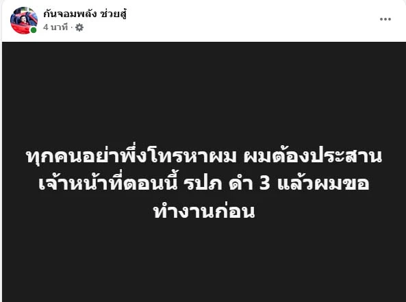 ในเวลาใกล้เคียงกัน เพจ “กันจอมพลัง ช่วยสู้” ได้โพสต์ข้อความเร่งด่วนว่า