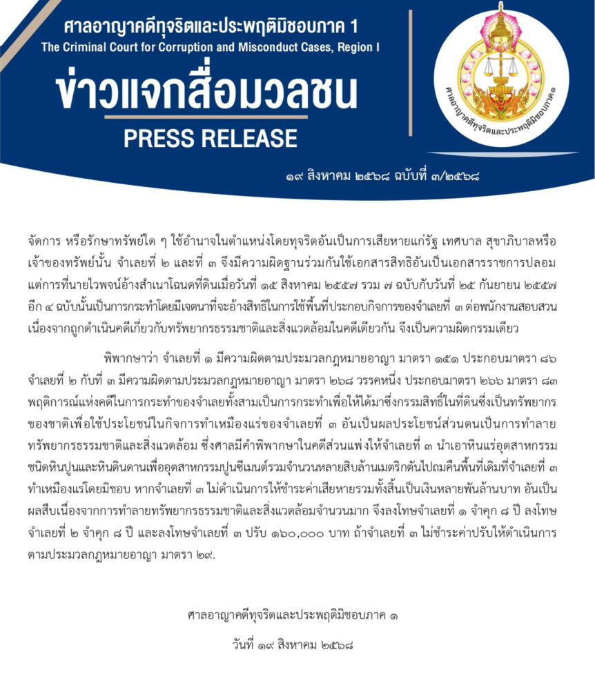 ศาลชี้ชัด ว่าการกระทำดังกล่าวเป็นการละเมิดสิทธิของรัฐ และทำให้ทรัพยากรธรรมชาติถูกทำลาย ก่อให้เกิดความเสียหายมูลค่าหลายพันล้านบาท ทั้งในรูปของหินปูนและหินดินดานที่ถูกนำไปใช้ผิดกฎหมาย รวมถึงระบบนิเวศที่ถูกกระทบอย่างรุนแรง