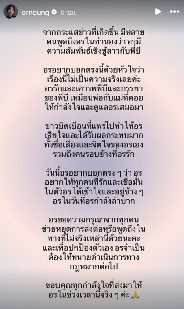 นอกจากนี้ อรอุ๋งยังเผยว่า เธอจำเป็นต้องดำเนินการทางกฎหมายเพื่อปกป้องสิทธิ์ของตัวเอง พร้อมขอบคุณแฟนคลับที่ยังคงส่งกำลังใจมาอย่างล้นหลามในช่วงเวลาที่ยากลำบาก
