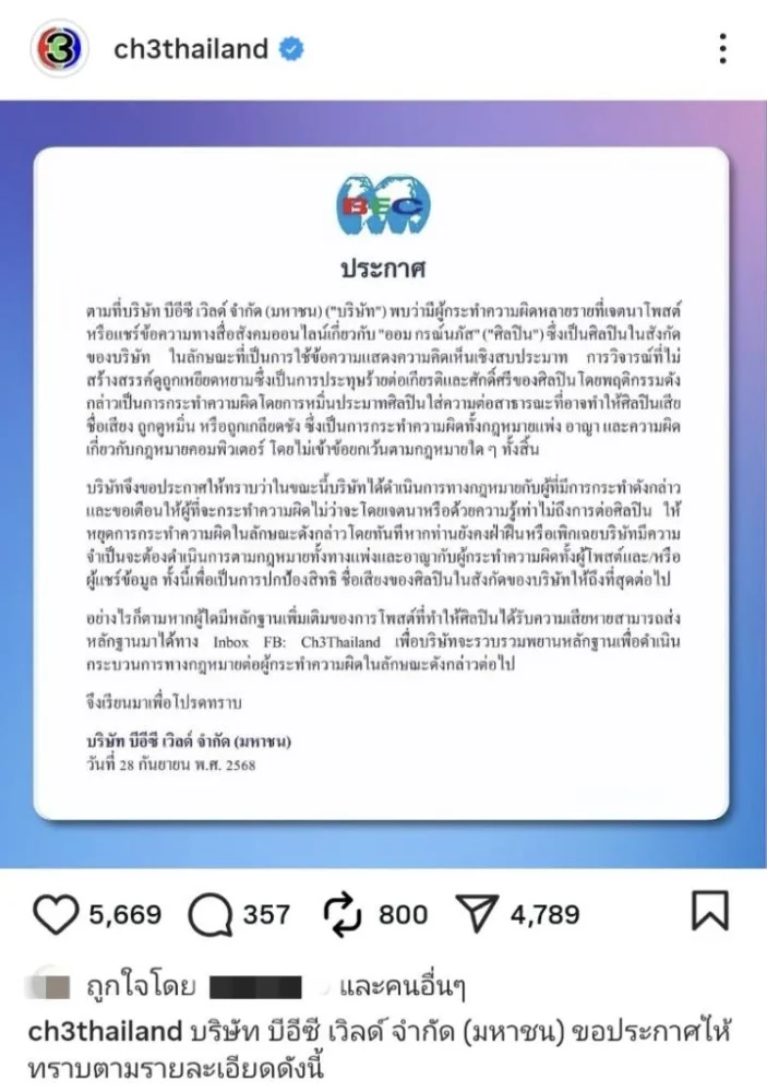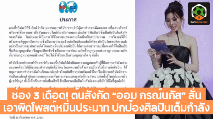 กลายเป็นดราม่าร้อนแรงที่เขย่าวงการบันเทิงไทยและโลกออนไลน์ เมื่อ บริษัท บีอีซี เวิลด์ จำกัด (มหาชน) หรือที่รู้จักกันในชื่อ “ช่อง 3” ต้นสังกัดของนักแสดงสาวมากฝีมือ “ออม กรณ์นภัส เศรษฐรัตนพงศ์” ออกแถลงการณ์อย่างเป็นทางการ ประกาศ เอาผิดผู้ที่โพสต์และแชร์ข้อความหมิ่นประมาทศิลปินในสังกัด หลังพบการกระทำที่เข้าข่าย ดูหมิ่น เหยียดหยาม และใส่ร้าย สร้างความเสียหายต่อชื่อเสียงของศิลปิน ซึ่งเข้าข่ายความผิดทั้ง กฎหมายแพ่ง, อาญา และ กฎหมายคอมพิวเตอร์
